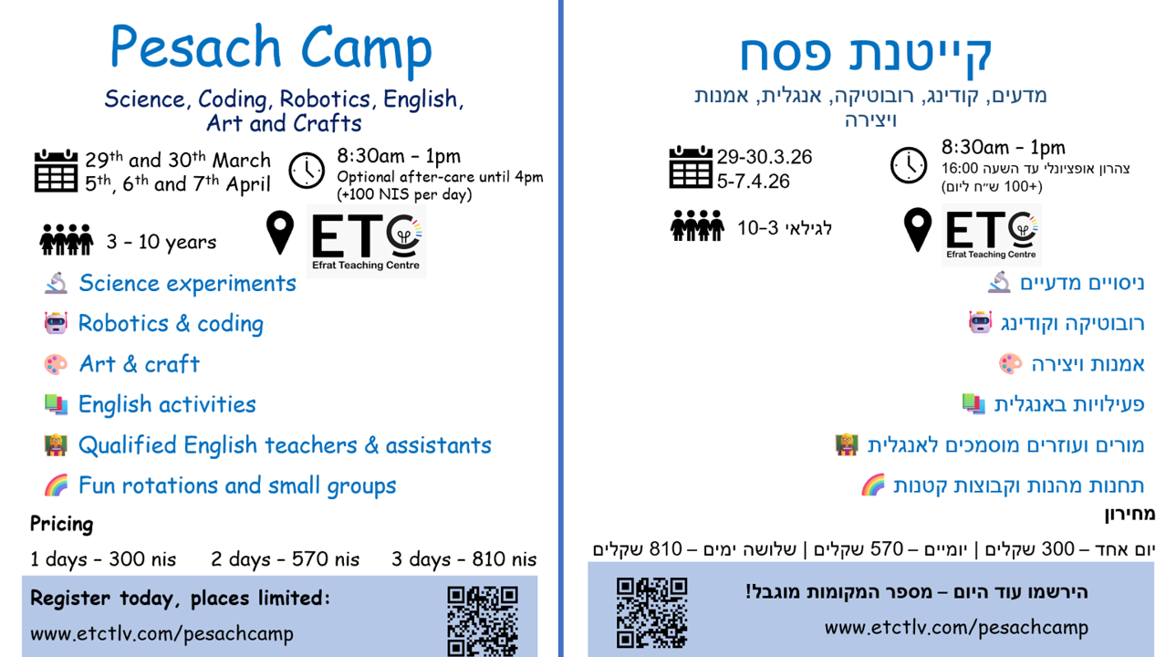 Give your child an unforgettable holiday experience full of discovery, creativity, and fun! A unique, specialist workshop in Tel Aviv that blends science, technology, and creativity for English and Hebrew speakers!
